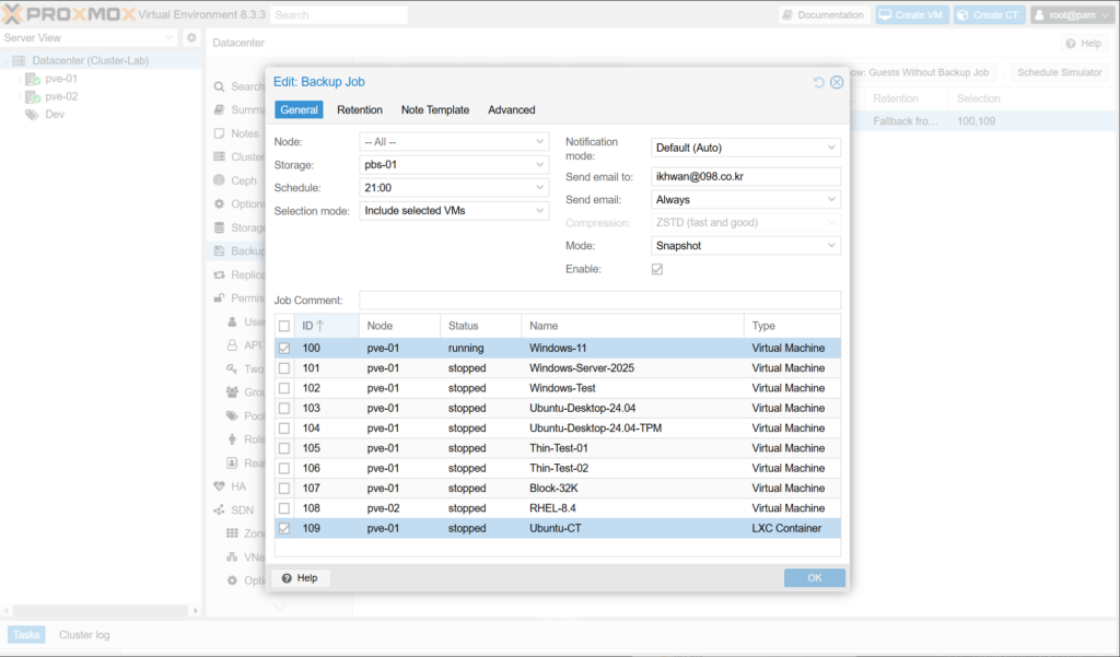 Datacenter > Backup > Edit는 선택한 백업 일정을 수정합니다.