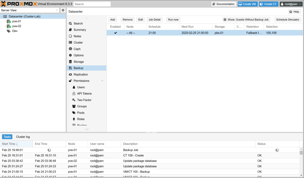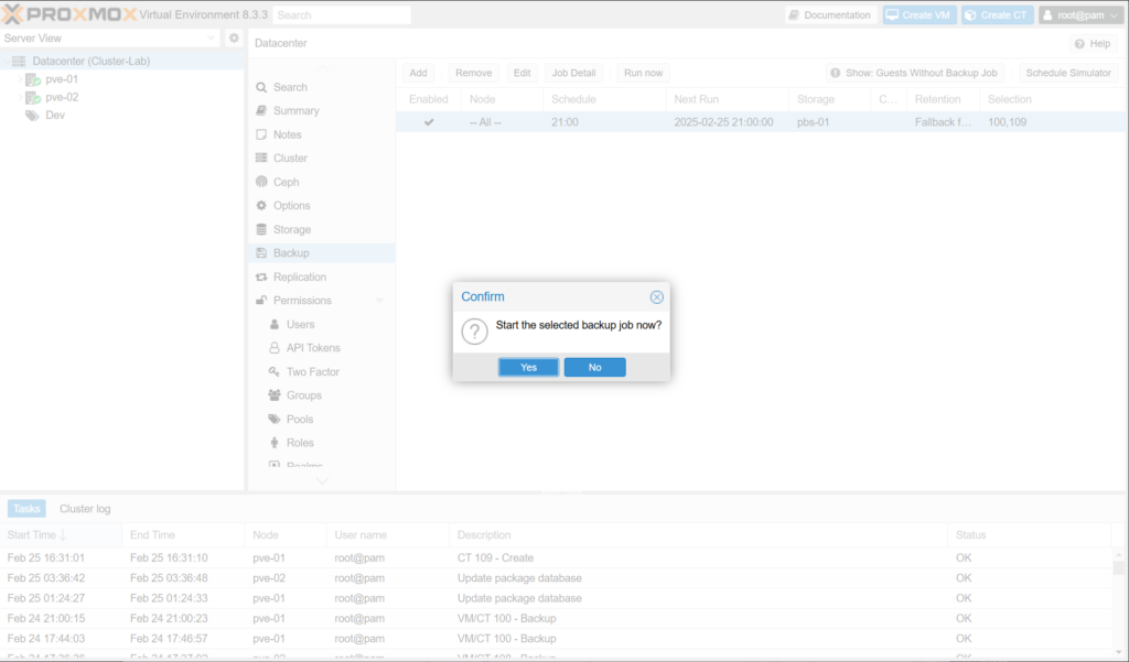 Datacenter > Backup > Run now는 선택한 백업 일정을 일정에 도달하지 않았어도 지금 실행합니다.