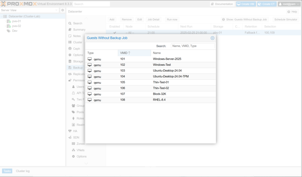 Datacenter > Backup > Show: Guests Without Backup Job는 현재 백업 일정에 선택되지 않은 VM 목록을 보여줍니다.