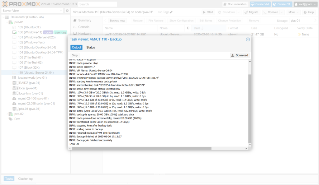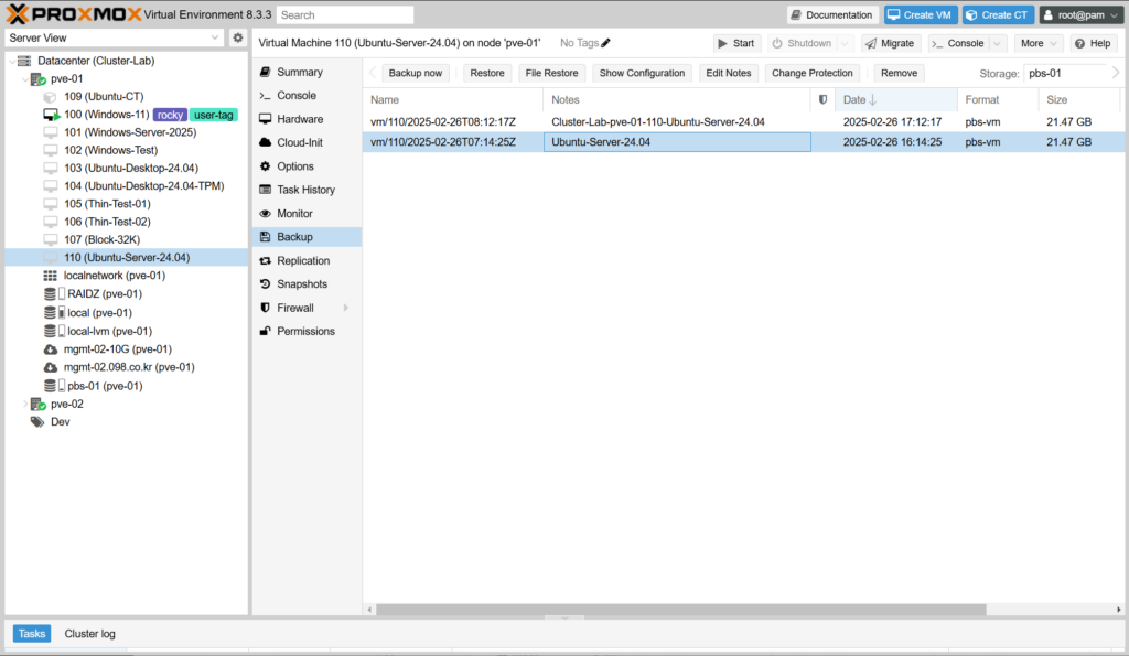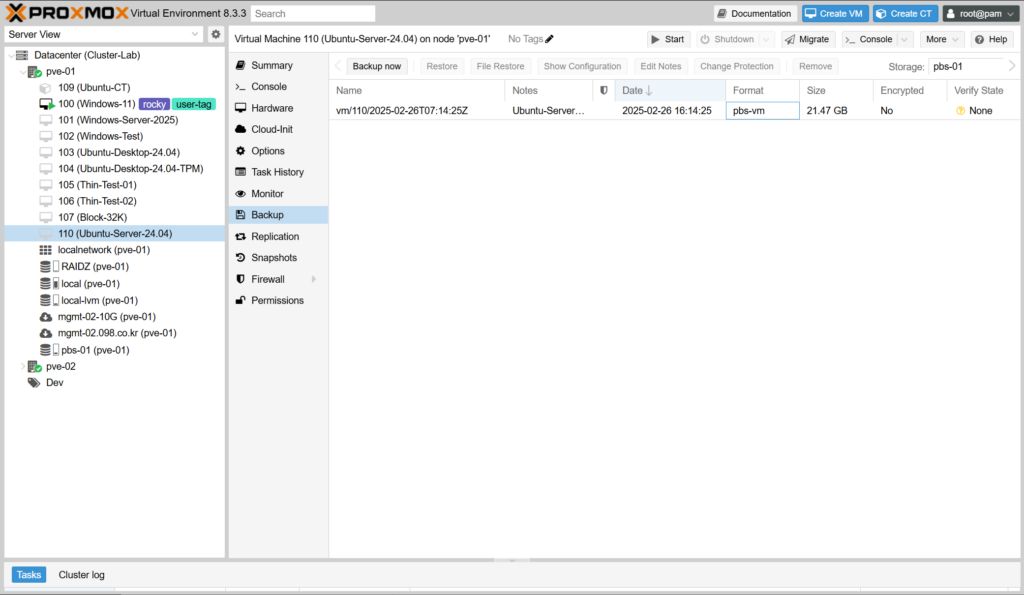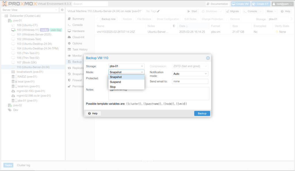 - Stop : VM/CT를 끄고 백업을 진행합니다. 백업이 끝나면 다시 켭니다.