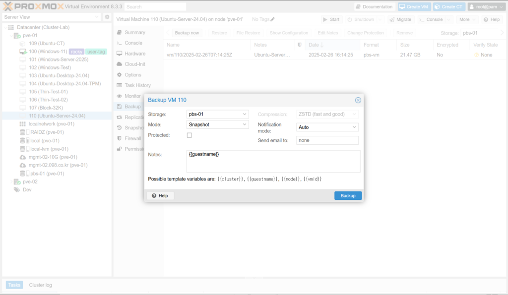 {{cluster}}-{{node}}-{{vmid}}-{{guestname}}(12) Backup 단추를 클릭합니다.