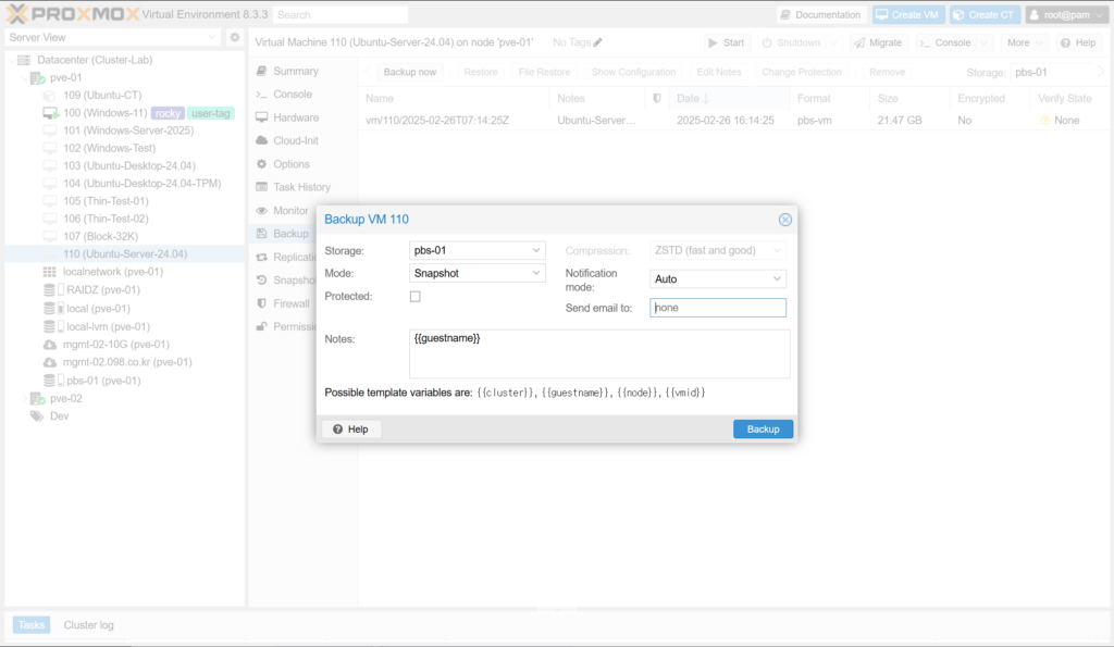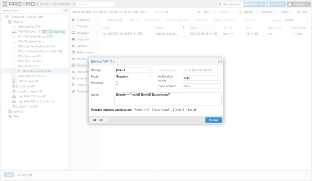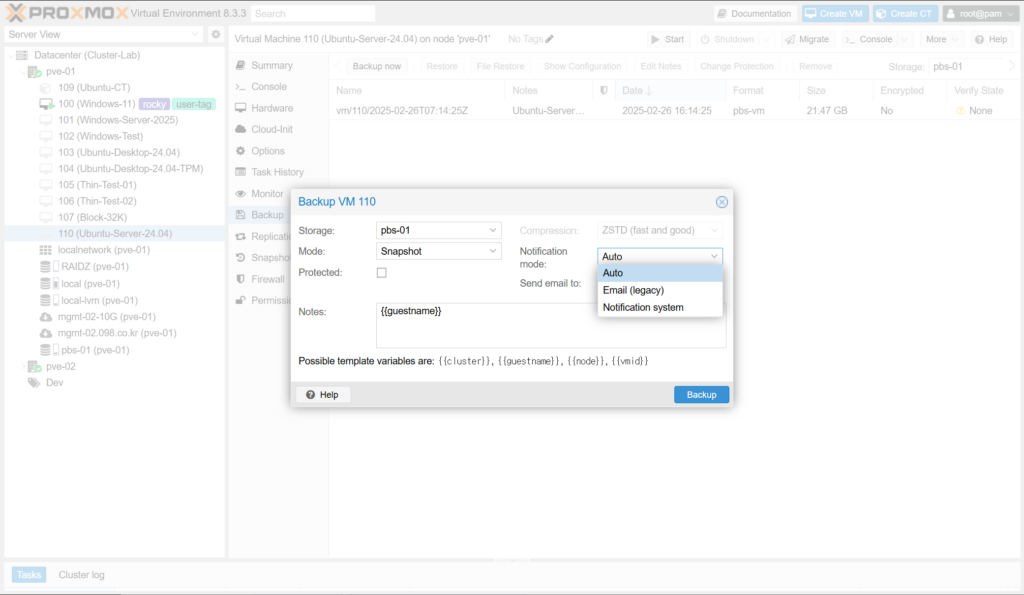 (11) Notes에 백업 파일의 Notes 란에 기록될 형식을 지정합니다. {{cluster}}, {{guestname}}, {{node}}, {{vmid}} 등의 변수를 조합해서 사용할 수 있습니다.