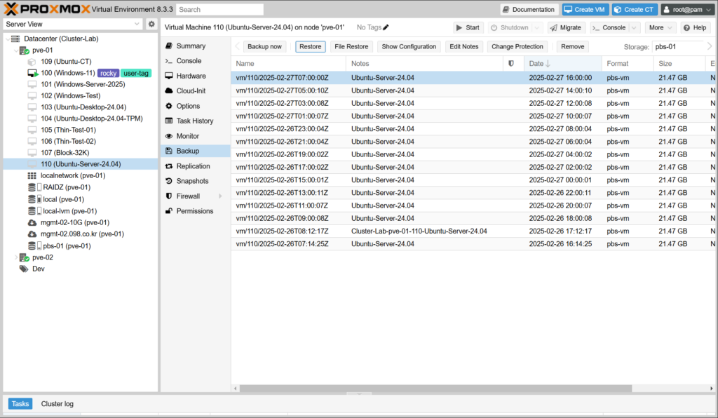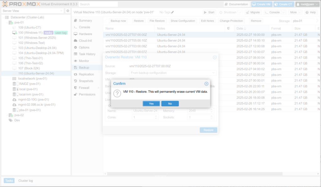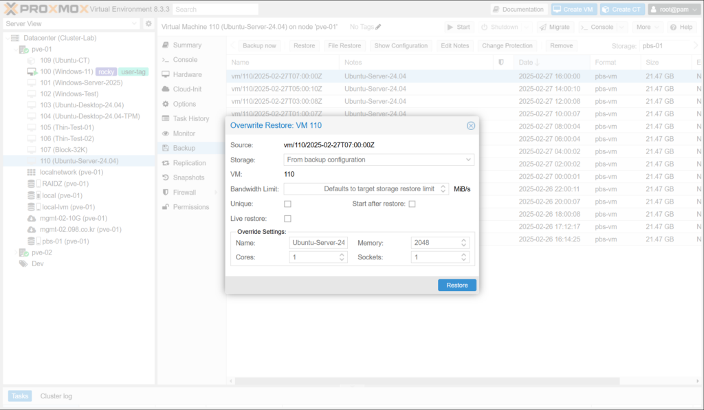 대용량 백업을 복원하는 데 시간이 오래 걸릴 수 있으며, 이때 게스트는 여전히 사용할 수 없습니다. Proxmox 백업 서버에 저장된 VM 백업의 경우 라이브 복원 옵션을 사용하여 이 대기 시간을 줄일 수 있습니다.