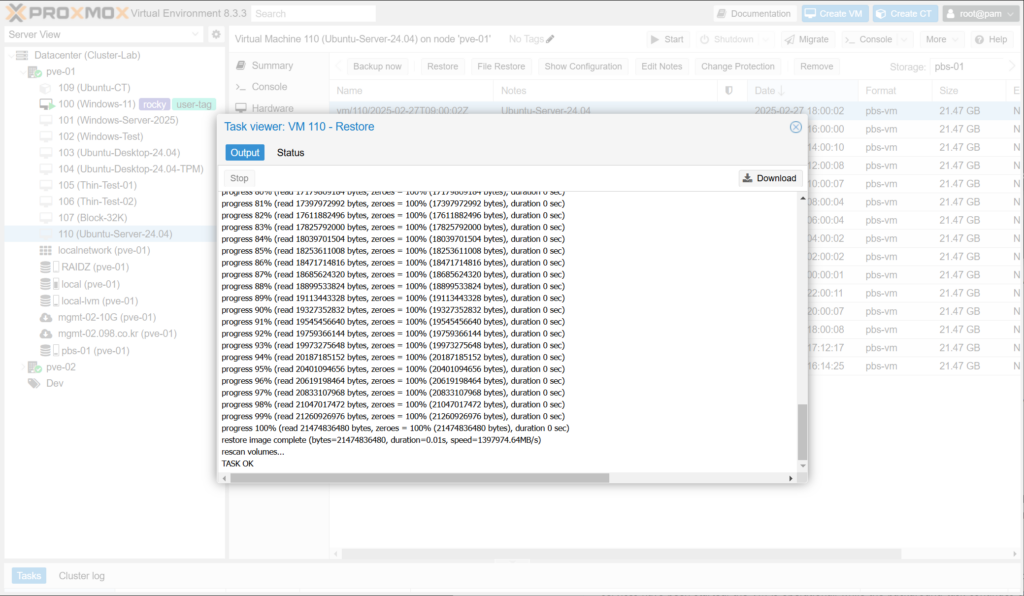 GUI의 확인란 또는 qmrestore의 –live-restore 인수를 통해 실시간 복원을 사용하도록 설정하면 복원이 시작되는 즉시 VM이 시작됩니다. 데이터는 백그라운드에서 복사되며, VM이 활발하게 액세스 중인 청크에 우선순위를 둡니다.