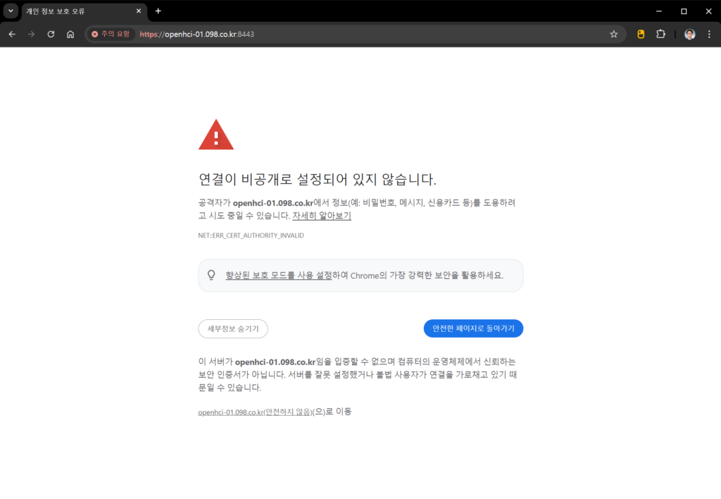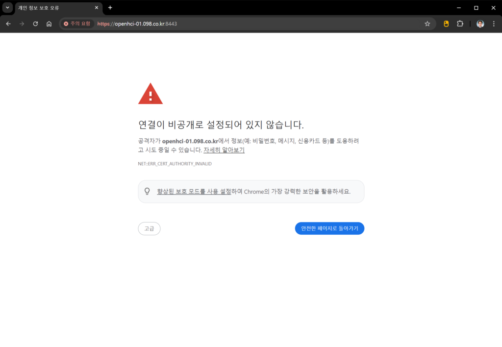 웹 브라우저를 열고 접속하면 사설인증서가 설치된 상태이기 때문에, 보안 경고가 표시됩니다. “고급” 단추를 누릅니다.
