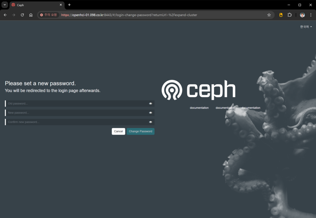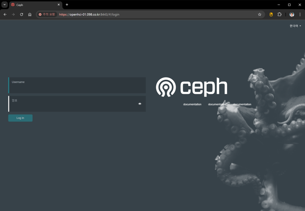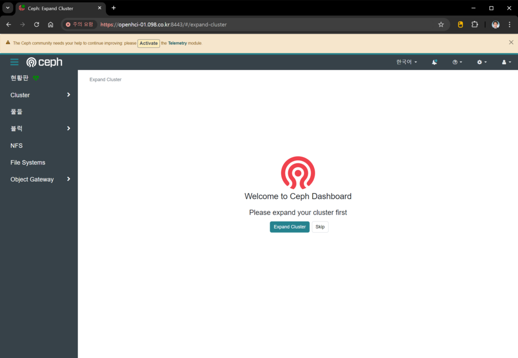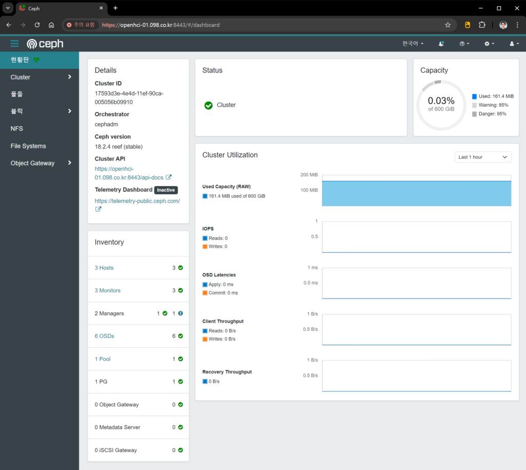 (뭔가 좀 썰렁하지만) 드디어 Ceph Dashboard 페이지가 열렸습니다.
