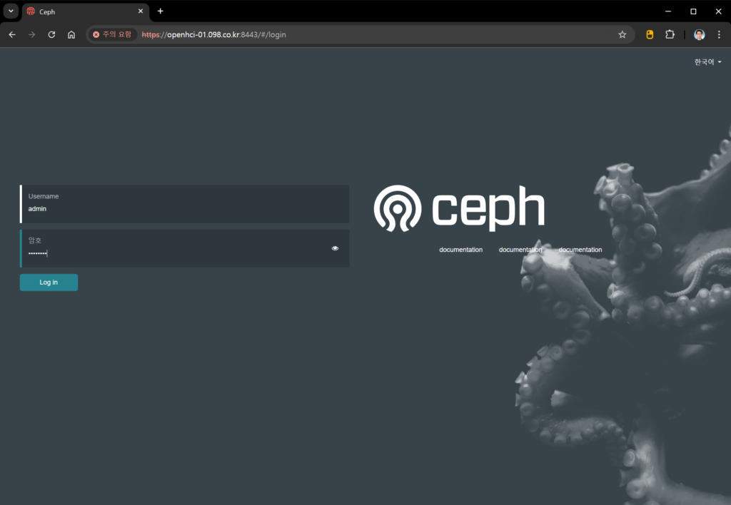 Ceph Dashboard 로그인 화면이 표시됩니다. Username에 admin, 암호에 부트스트랩 과정에서 만들어진 임시 암호를 입력하고, “Login in” 단추를 누릅니다.