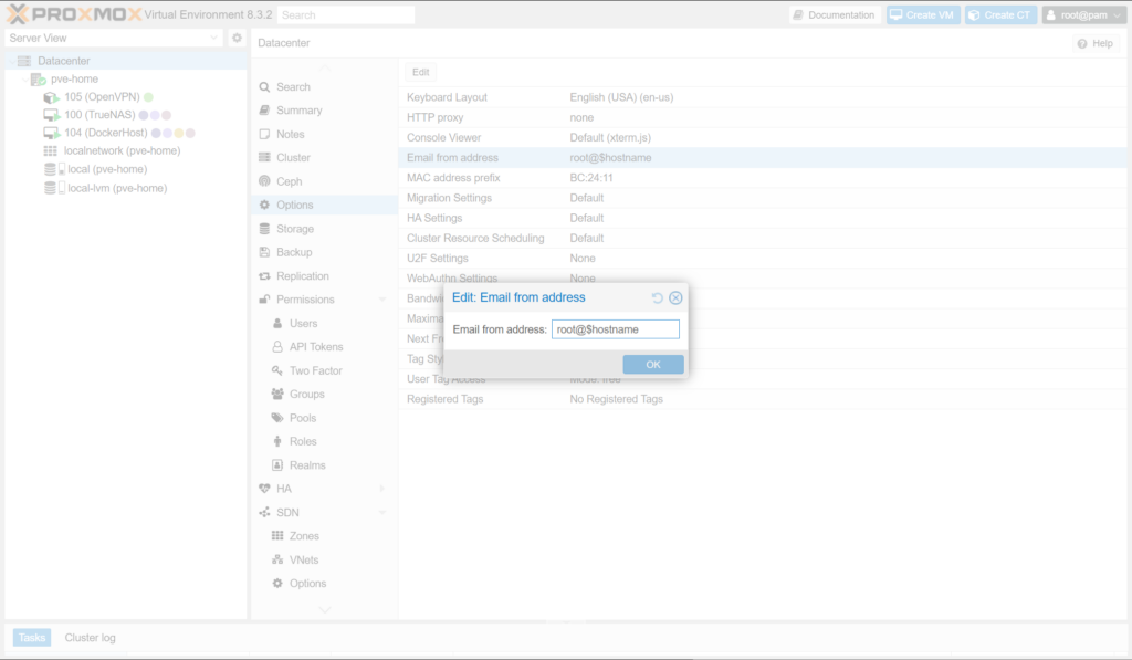 Datacenter > Options > Email from address은 Proxmox VE가 발송하는 모든 시스템 이메일의 발신자 주소를 지정합니다.