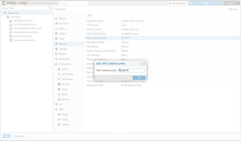 Datacenter > Options > MAC address prefix은 Proxmox VE에서 만드는 VM과 LXC 컨테이너의 가상 네트워크 인터페이스에 사용할 MAC 주소의 앞 3자리를 지정합니다.