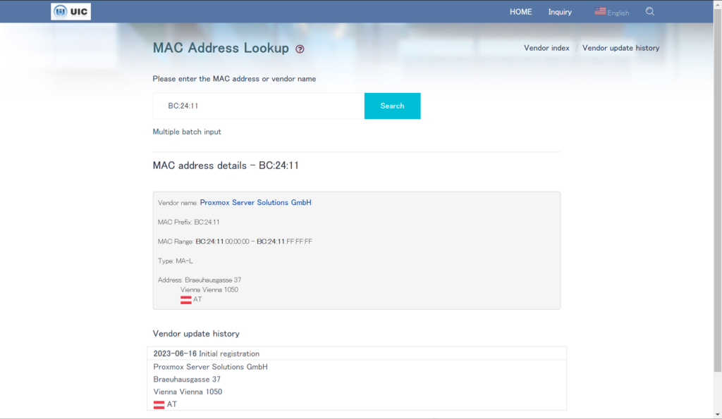 OUI 값 BC:24:11를 조회 사이트에서 검색해보면, 그림 처럼 Proxmox Server Solutions GmbH 사에 할당되었다고 나옵니다.