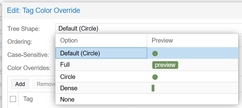 (5) Tree Shape는 그림과 같이 태그가 표시되는 모양을 지정합니다. 기본값은 Circle 입니다. none을 선택하면 태그가 표시되지 않습니다.