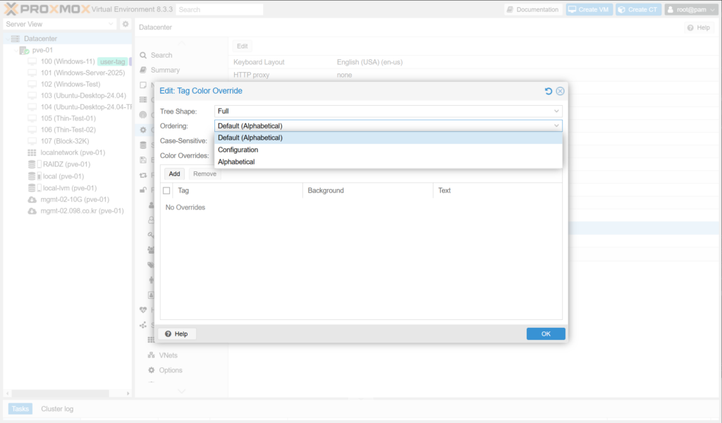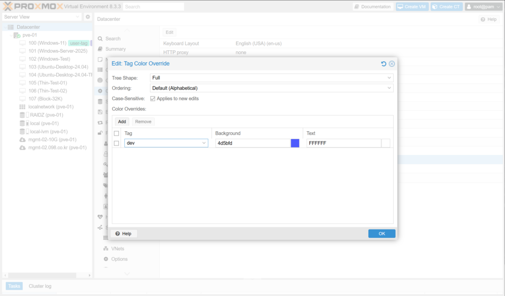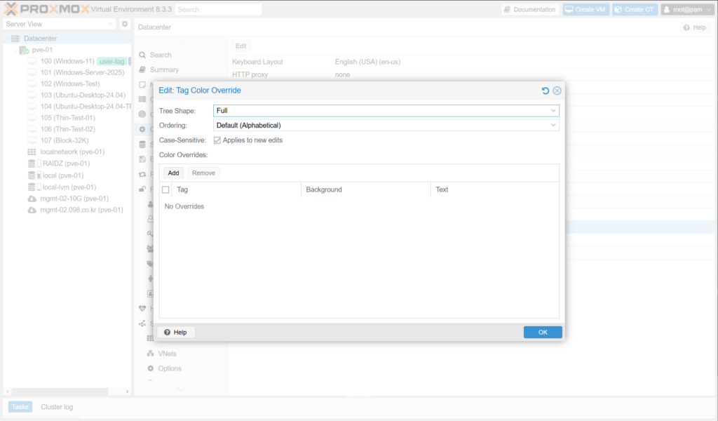 Datacenter > Options > Tag Style Override는 Web UI에 표시되는 태그의 모양, 표시 순서, 색상 등을 정의합니다.