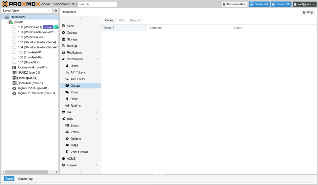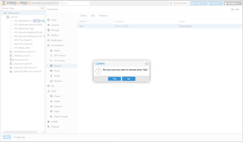 Datacenter > Permission > Groups > Remove는 그룹의 제거(Remove)합니다.