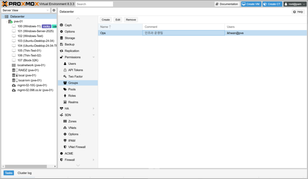 Datacenter > Permission > Groups > Remove는 그룹의 제거(Remove)합니다.