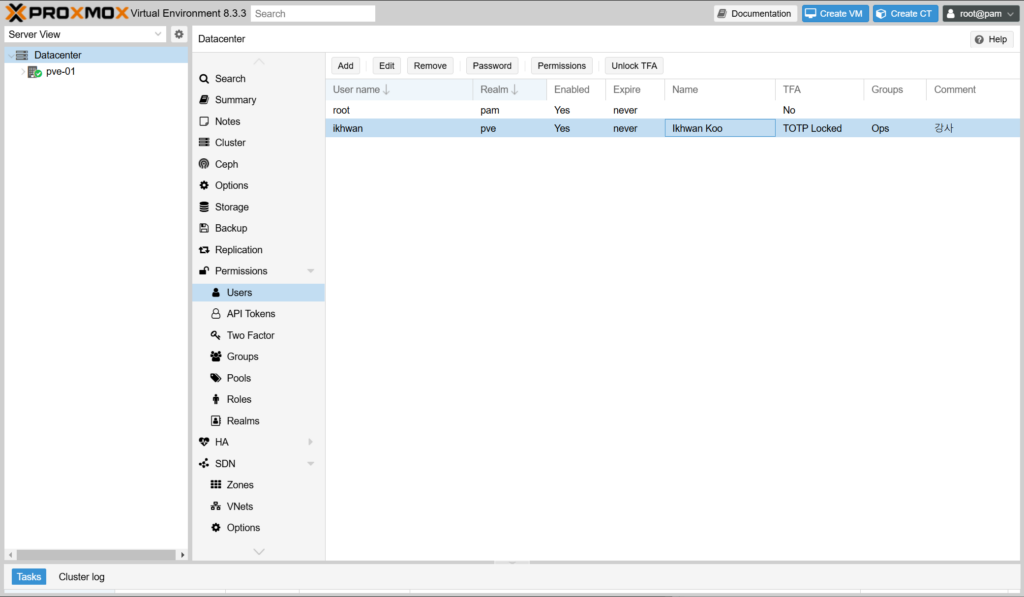 (1) Datacenter > Permission > Users 메뉴를 선택합니다. 잠긴 사용자는 TFA 컬럼에 “TOTP Locked”라고 표시됩니다.