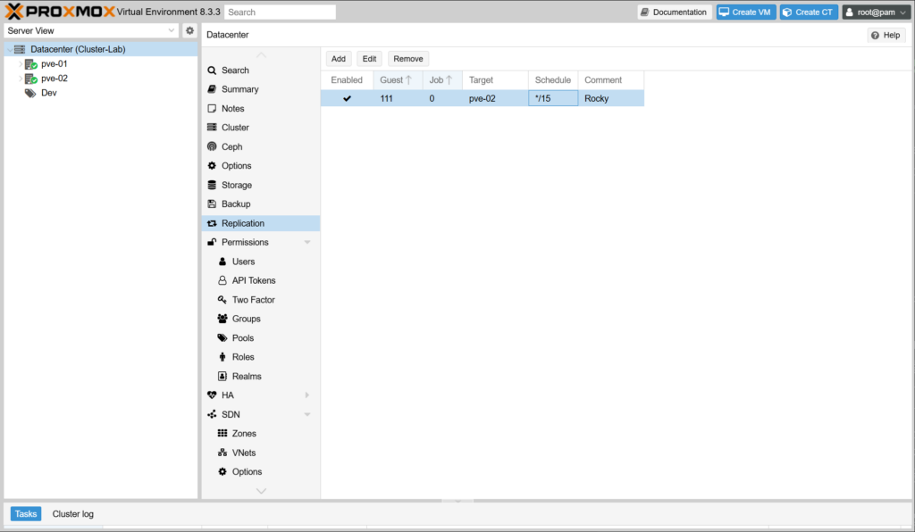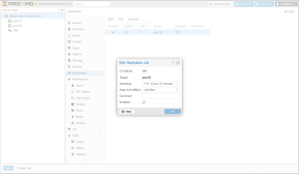 Datacenter > Replication > Edit 는 복제(Replication) 작업을 수정합니다.