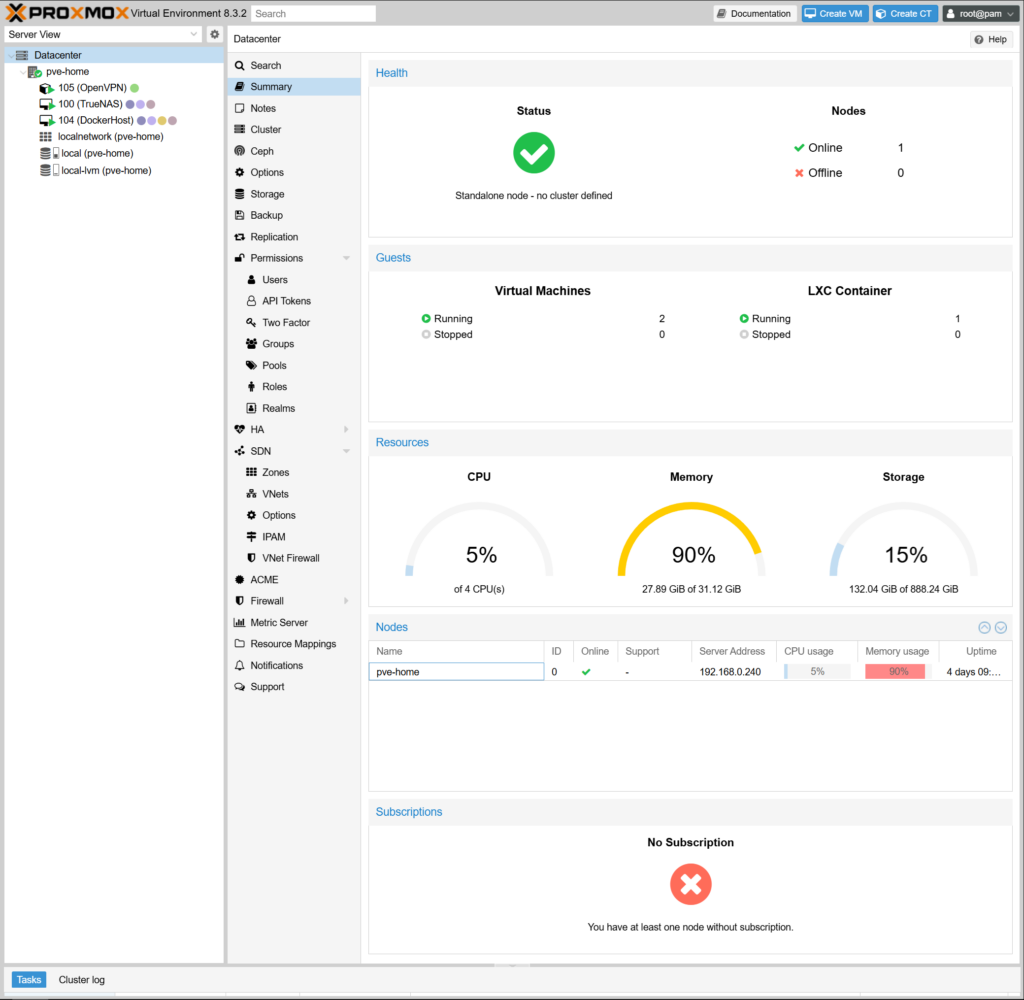 Datacenter에 등록되어 있는 모든 노드의 CPU, Memory, Storage의 용량 정보를 하나로 합쳐서 보여줍니다. 전체 사용량 정보를 쉽게 파악하기 위한 용도라고 보면 됩니다.
