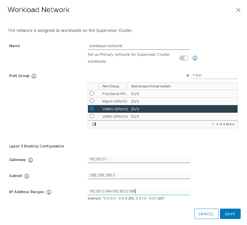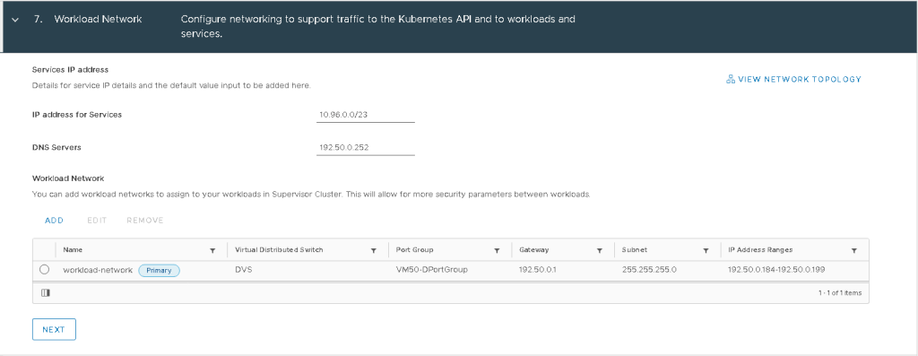 서비스의 IP 주소 범위는 기본값으로 둘 수 있지만, 워크로드 네트워크를 추가하려면 ADD 버튼을 클릭해야 한다. 워크로드 네트워크의 포트 그룹을 선택하고 네트워크에 사용할 수 있는 게이트웨이, 서브넷 마스크 및 IP 주소 범위를 제공하십시오. 나는 16개의 프리 IP 주소를 제공했다.