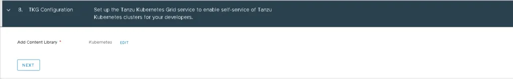 다음으로, TKG 이미지를 보관하는 Content Library를 선택한다. 전제조건에서 언급했던 것처럼 이미 만들어졌어야 한다. 내 설정으로는 콘텐츠 라이브러리를 쿠버네티스라고 불렀다. 이것은 TKG 이미지 구독 URL – https://wp-content.vmware.com/v2/latest/lib.json과 동기화되어야 한다. 이 컨텐츠 라이브러리는 vSphere with Tanzu에서 자동으로 사용할 수 있으며, 나중에 vSphere with Tanzu에서 사용할 수 있으며, Air-Gapped/Dark 사이트에서 Tanzu와 함께 vSphere를 설정하는 경우 Air-Gapped 환경에서 Content Library를 설정하는 방법에 대한 문서화된 절차가 있다.