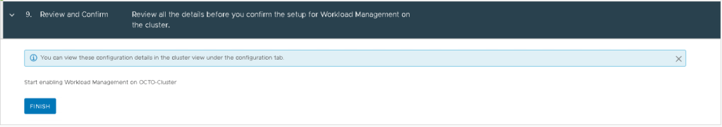 마지막으로 vSphere with Tanzu를 통해 워크로드 관리를 지원하기 위한 모든 작업이 준비되었다. [Finish] 단추를 클릭한다.