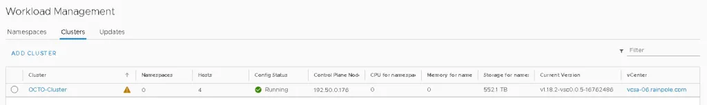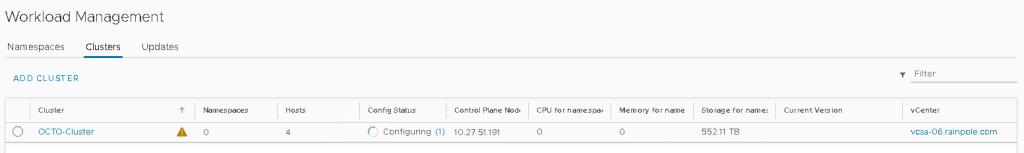 이제 Supervisor 클러스터 제어부 VM을 배포하고 Management 네트워크와 Workload 네트워크에 연결하는 등 많은 구성 단계가 수행되기 시작한다. 제어부 API 서버는 Frontend 네트워크에 구성된 IP 주소 범위에서 할당된 로드 밸런서 IP 주소도 얻어야 한다. 배포에 대한 로그 출력을 추적하려면 SSH를 vCenter Server로 이동하고 /var/log/vmware/wcp로 이동한 다음 tail -f wcpsvc.log를 실행한다. 이렇게 하면 많은 로깅이 생성되지만 장애의 근본 원인을 식별하는 데 유용할 수 있다는 점에 유의하십시오. 배포가 성공적으로 완료되면 로드 밸런서/프론트 엔드 IP 주소 범위 중 하나로 구성된 제어부 IP 주소가 표시되어야 한다. 사실, 나의 경우, 192.50.0.176 그 범위의 첫 번째 IP 주소다.