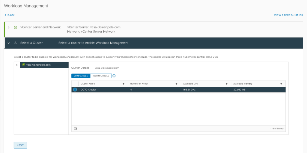 다음으로 Tanzu와 함께 vSphere를 설치할 클러스터를 선택하십시오. 내 환경에 클러스터가 하나뿐이므로 이 옵션만 사용할 수 있다.