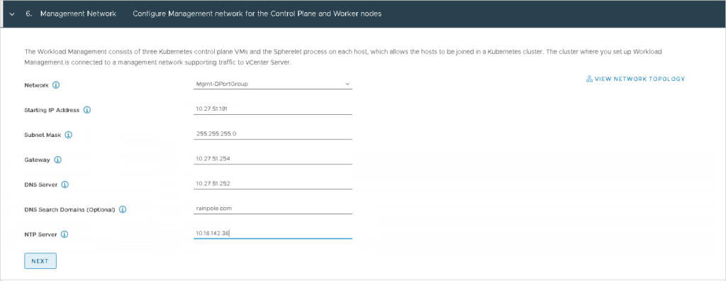 이제 Management 네트워크를 설정한다. 슈퍼바이저 제어부 VM에서 사용할 IP 주소. 시작 IP 주소를 제공해야 하지만 최소 4개를 제공해야 한다. 3개 노드 감시자 통제면에는 최소한 이 수가 필요하다. 그러나 패치 적용, 업그레이드 등을 목적으로 사용 가능한 IP 주소가 더 많은지 확인하는 것이 유용할 것이다. 공식 문서는 이에 대한 지침을 제공해야 한다. NTP, DNS, 게이트웨이와 같은 나머지 필드는 자가 설명된다.