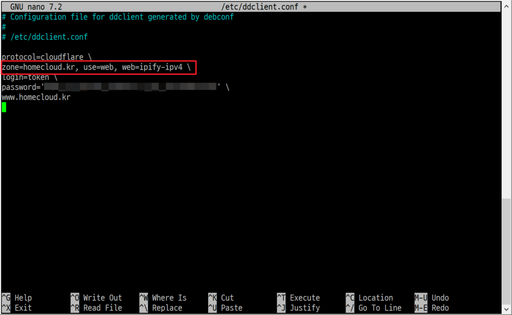 Feb 01 19:42:57 pve-02 ddclient[3851855]: WARNING: skipping host: www.homecloud.kr: 'zone=' is an invalid fully qu>(22) root@pve-02:~# nano /etc/ddclient.conf 명령으로 구성 파일을 엽니다.