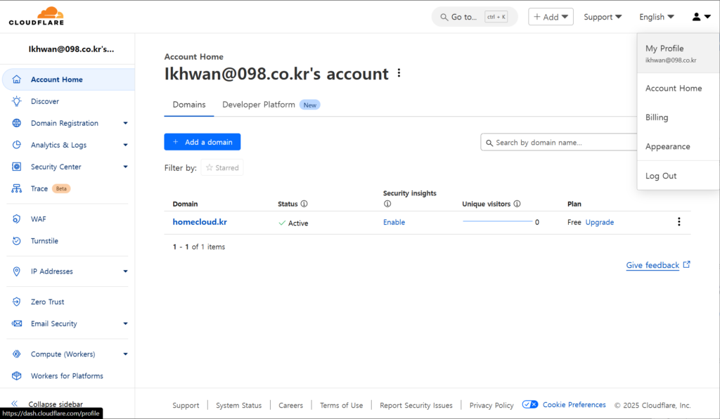 (1) Cloudflare에서 My Profile 메뉴 선택