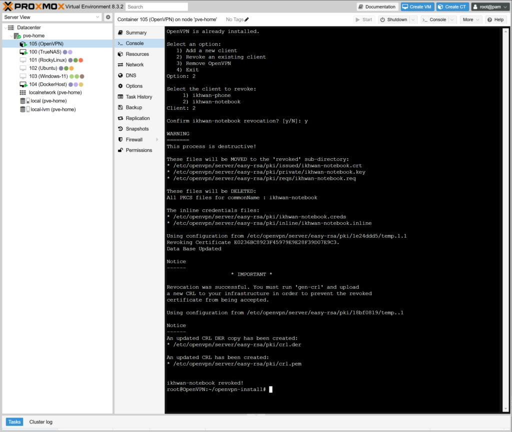 설치할 때 사용했던 openvpn-install.sh 스크립트 파일을 이용해서 OpenVPN 클라이언트(사용자)를 추가 또는 폐기(삭제)할 수도 있습니다.