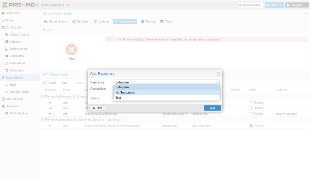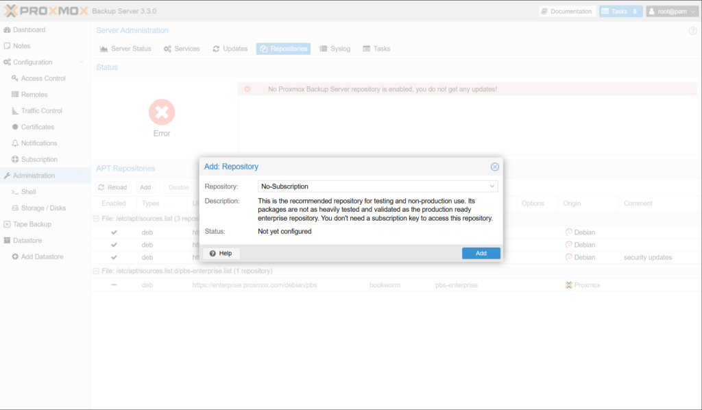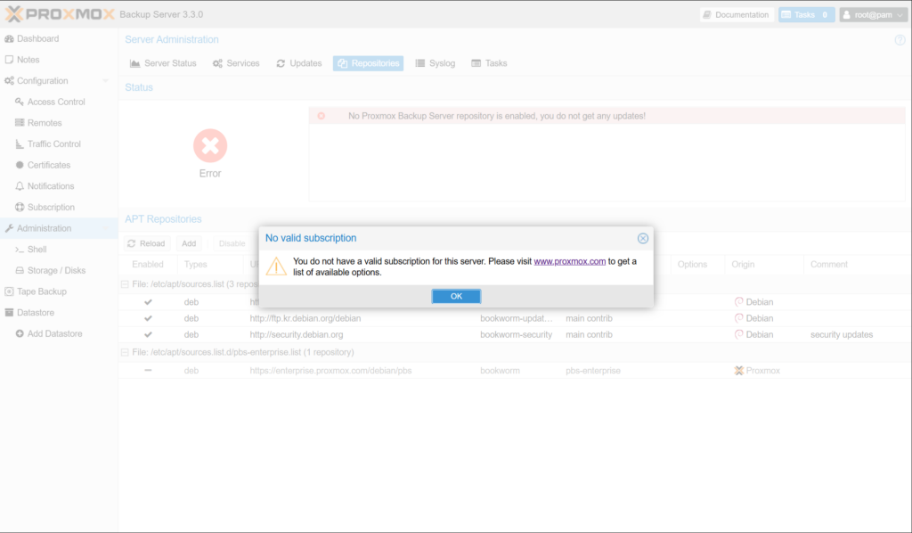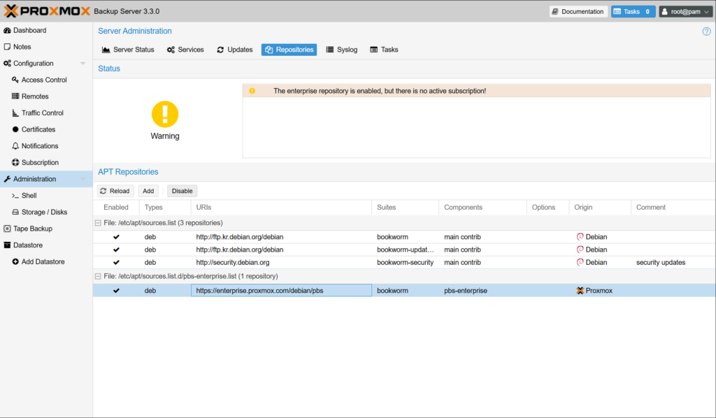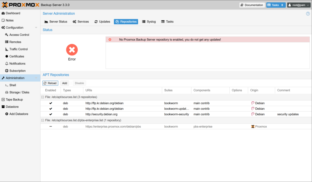 Proxmox Backup Server도 제일 먼저 해야할 것은 Repositories 설정입니다.