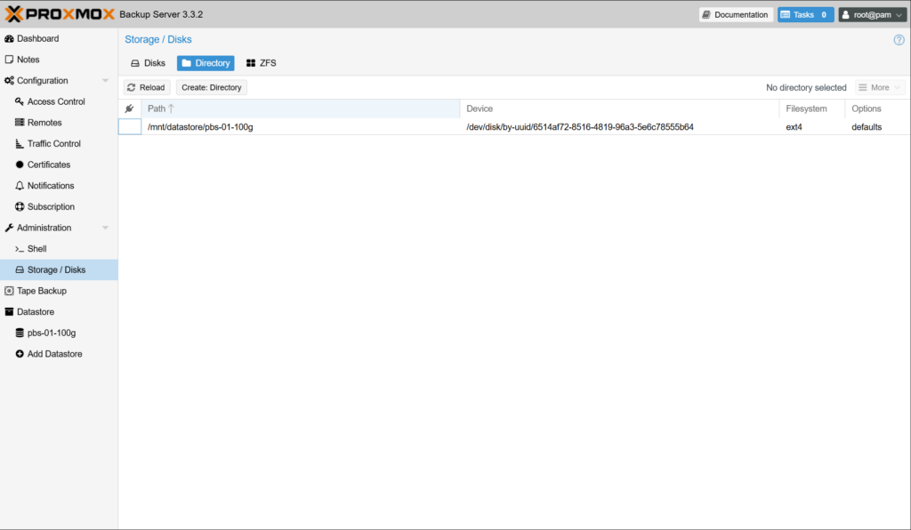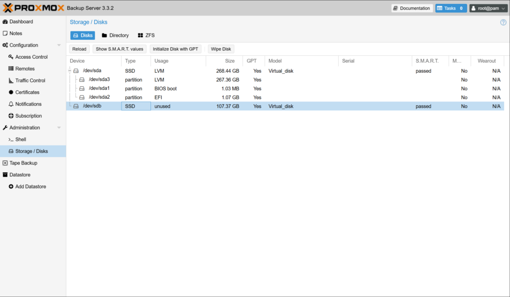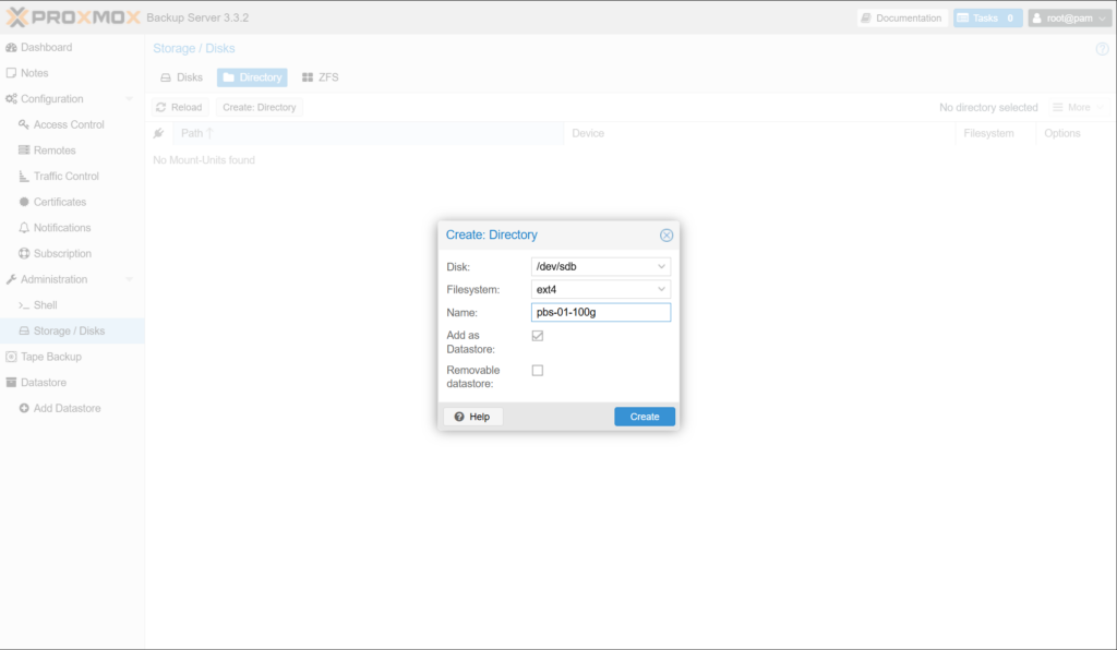 Proxmox Backup Server에서 백업 데이터 저장용으로 사용할 스토리지를 구성합니다.