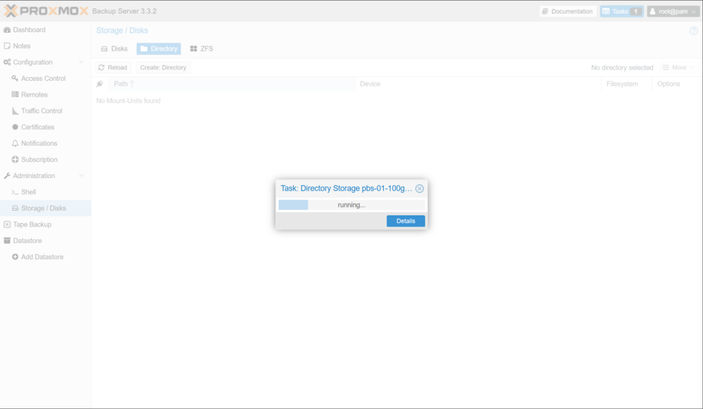 (10) 그림과 같은 대화상자가 표시되면서 Directory 유형의 스토리지 생성 작업이 진행됩니다. 완료되면 자동으로 대화상자가 사라집니다.