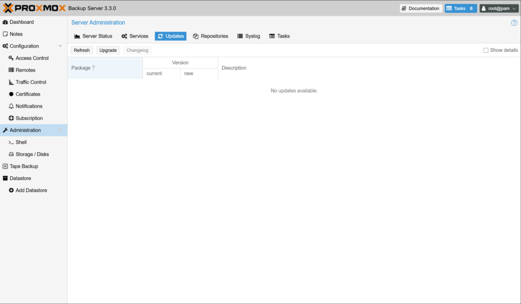Proxmox Backup Server의 Repositories를 설정한 다음 새로운 업데이트를 확인하고, 설치합니다.