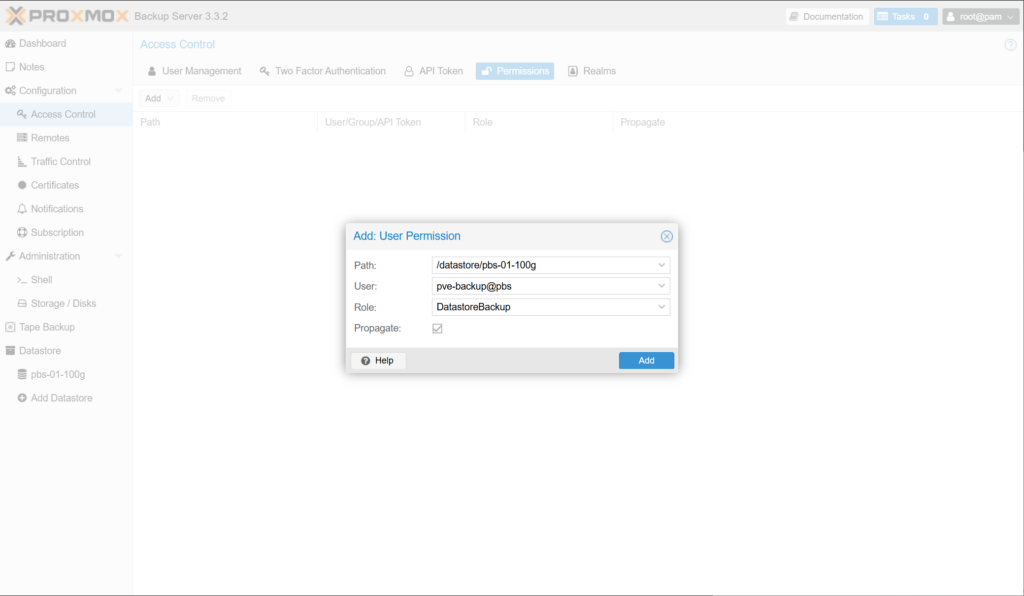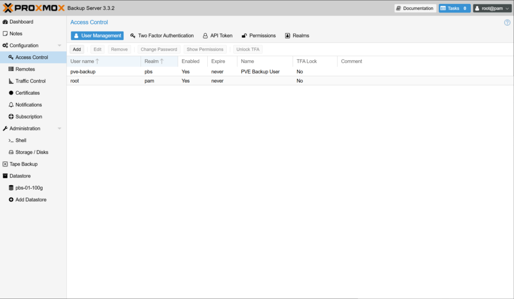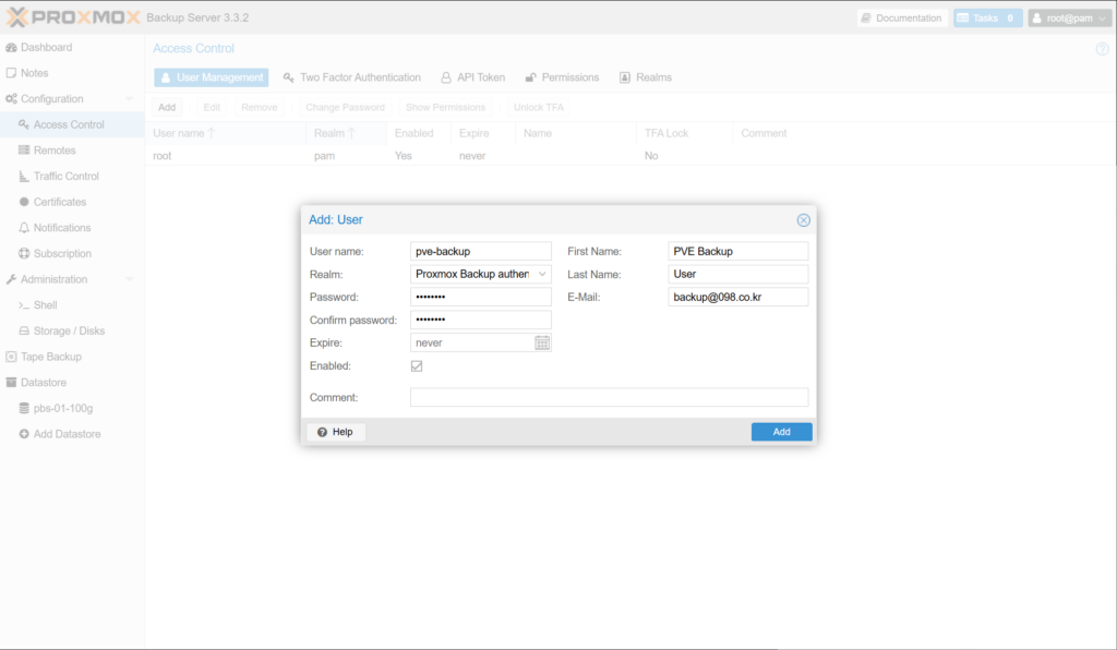 Proxmox VE가 Proxmox Backup Server에 연결하기 위해서는 적절한 데이터스토어에 대한 액세스 권한을 갖고 있는 사용자 계정 정보가 필요합니다. 백업용으로 사용할 계정을 추가하고, 권한을 주는 방법에 대해서 알아보겠습니다.