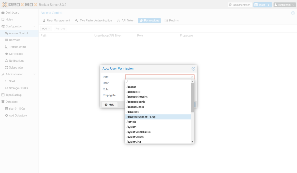 (5) Path에서 그림과 같은 목록 중에서 원하는 데이터스토어를 선택합니다. 이 예에서는 /datastore/pbs-01-100g를 선택합니다.