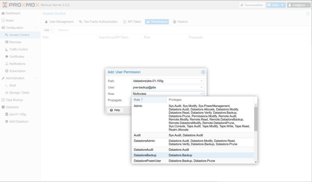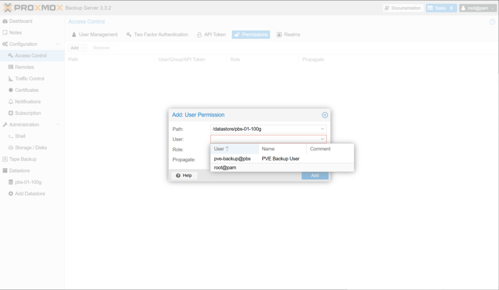 (6) User에서 그림과 같은 목록 중에서 원하는 사용자를 선택합니다. 이 예에서는 pve-backup@pbs를 선택합니다.