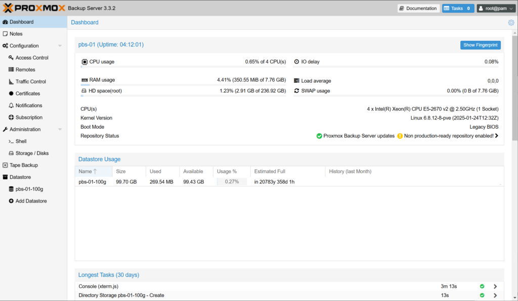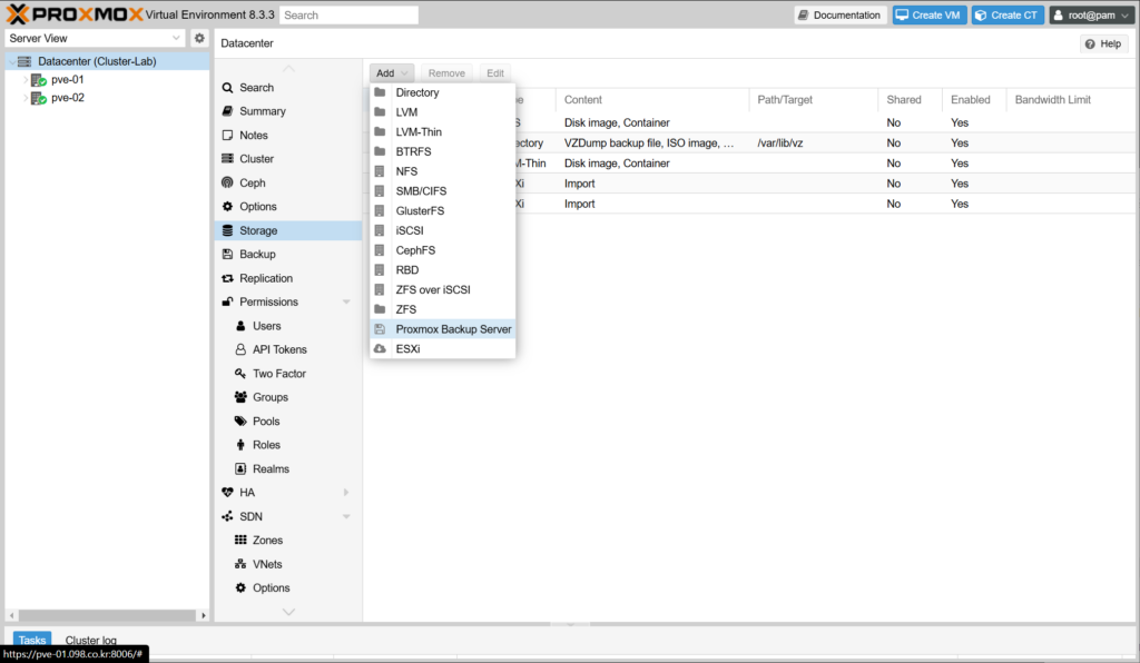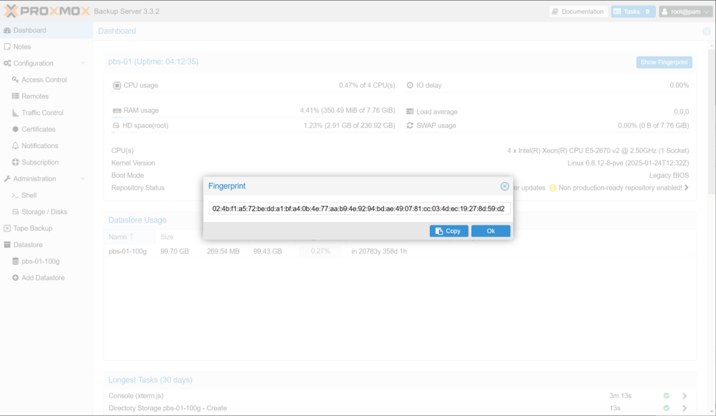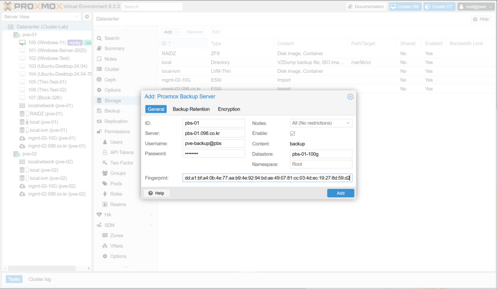 Proxmox VE에서 Proxmox Backup Server를 추가하려면 Proxmox Backup Server의 지문(Fingerprint) 이 있어야 합니다.