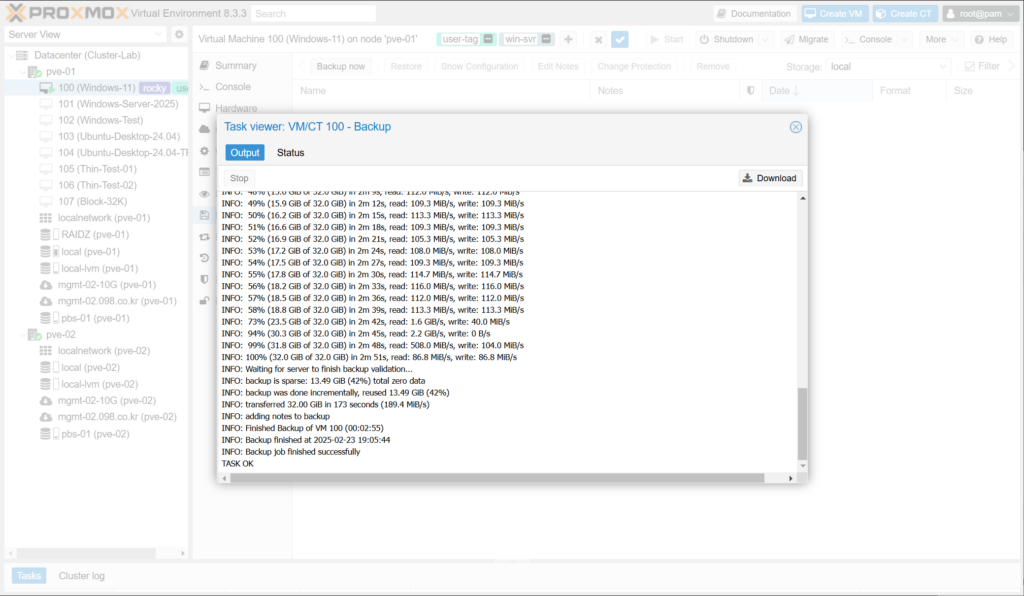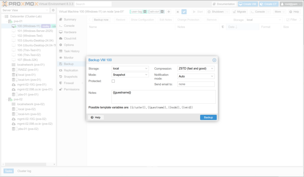 Proxmox VE에서 백업 기능은 각 VM의 Backup 메뉴, Datacenter의 Backup 메뉴, CLI 등을 통해서 설정할 수 있습니다.