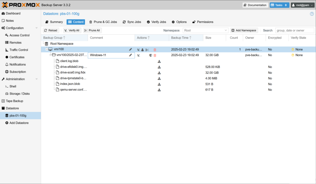 (10) Proxmox Backup Server에서 백업에 사용한 데이터스토어를 선택합니다. 예 Datastore > pbs-01-100