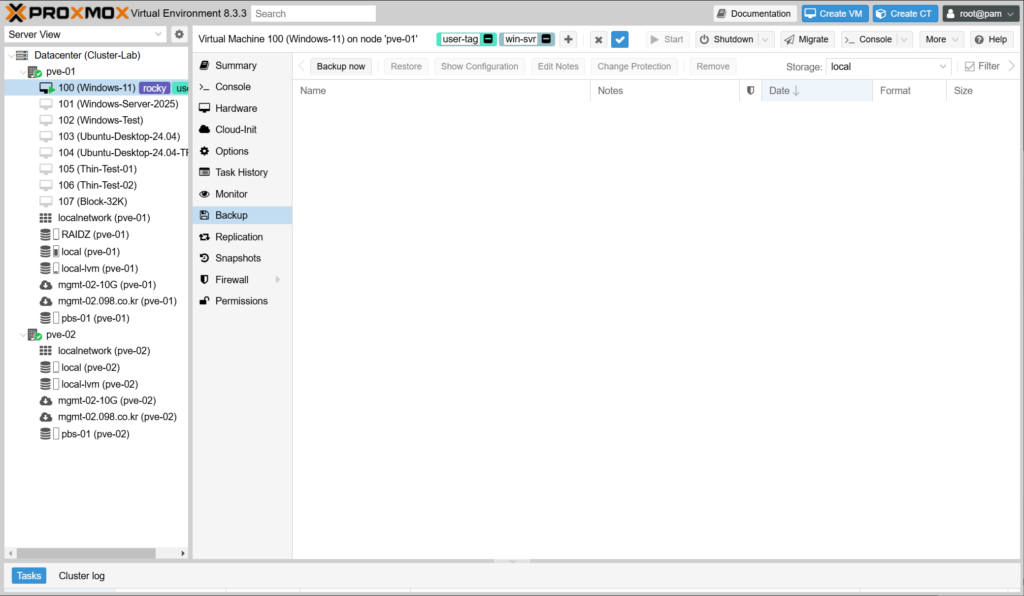 여기서는 VM의 Backup 메뉴를 통해서 Proxmox VE와 Proxmox Backup Server가 잘 연결되어서 동작하는지 정도만 확인하겠습니다. 자세한 내용은 Datacenter 부분에서 다루겠습니다.