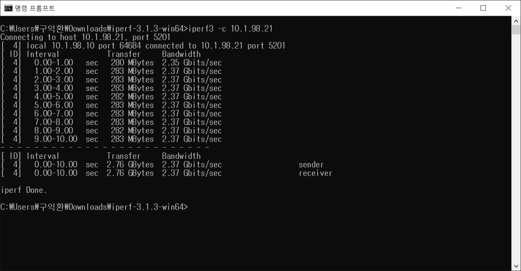 처음 속도 측정을 했을 때는 1.13Gbits/sec 정도 나왔습니다. ㅠ.ㅠ