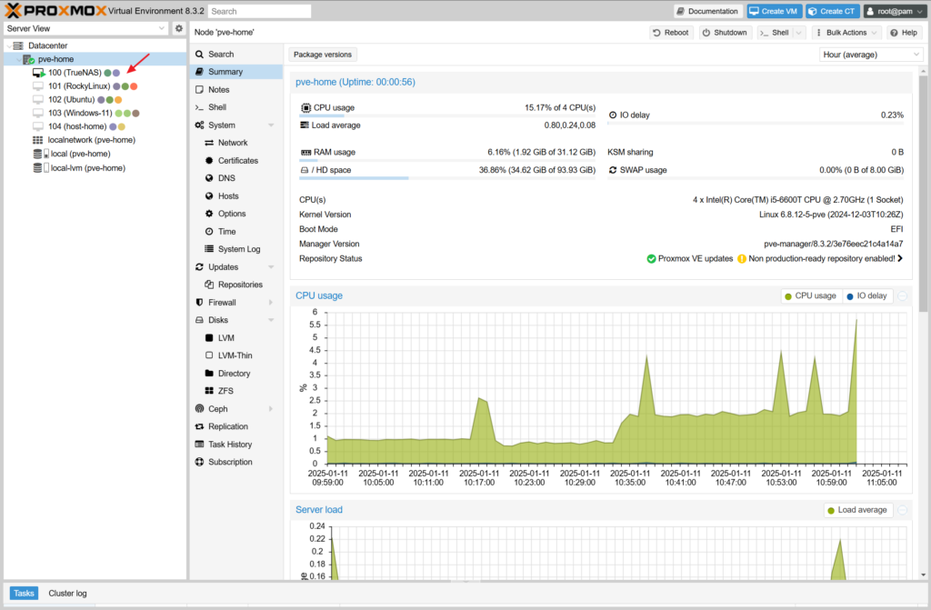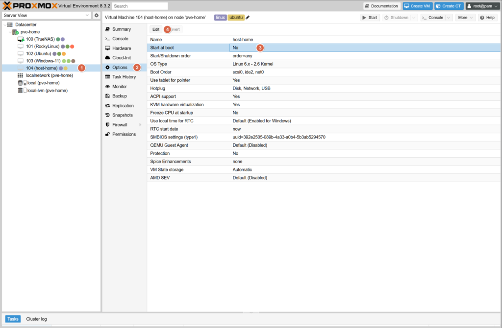 이렇게 Start at Boot 옵션이 선택된 VM은 Proxmox VE 호스트가 리부팅 될 때 자동으로 시작됩니다.