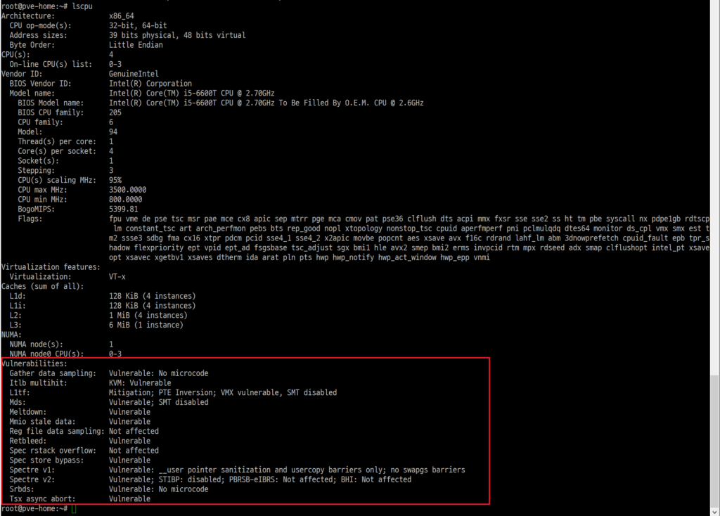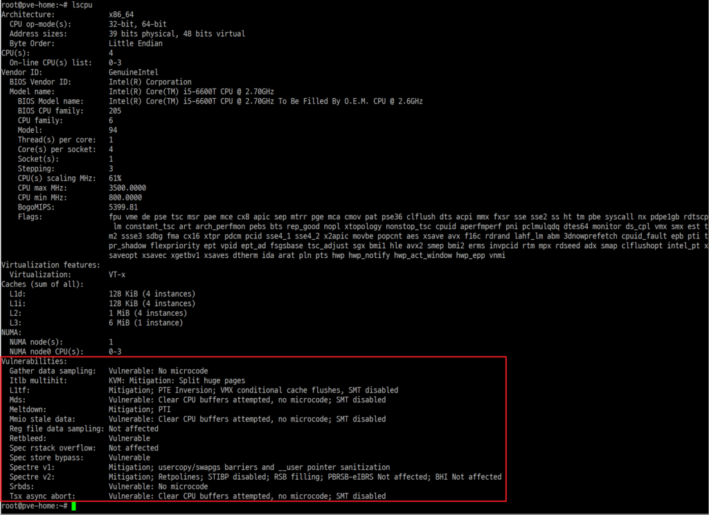 lscpu 명령을 사용하면 그림과 같은 결과를 보여줍니다. 이 중에 아래에 Vulnerabilities 아래에 표시된 것들이 CPU의 보안 취약점과 관련된 내용입니다.