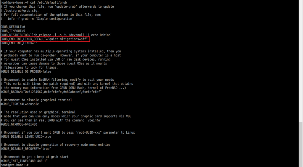 (2) /etc/default/grub 파일에서 GRUB_CMDLINE_LINUX_DEFAULT="quiet" 로 표시된 항목을 GRUB_CMDLINE_LINUX_DEFAULT="quiet mitigations=off"로 수정