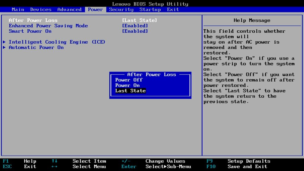 이 중에 추천하는 것은 Last State입니다. 이것을 선택하면 사용자가 꺼 놓은 경우에는 꺼진 상태로 가만히 있고, 만약 사용 중에 정전으로 꺼진 경우에는 자동으로 켜집니다.