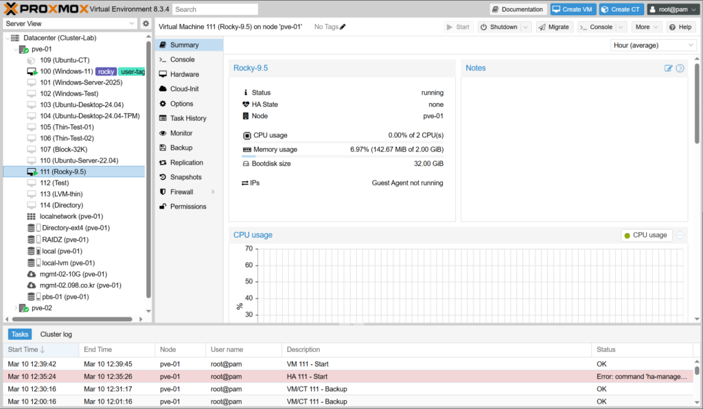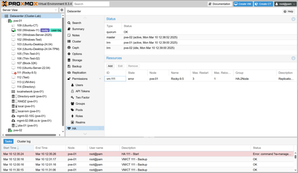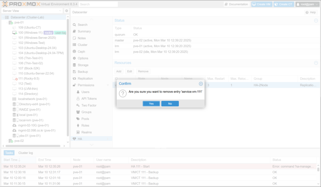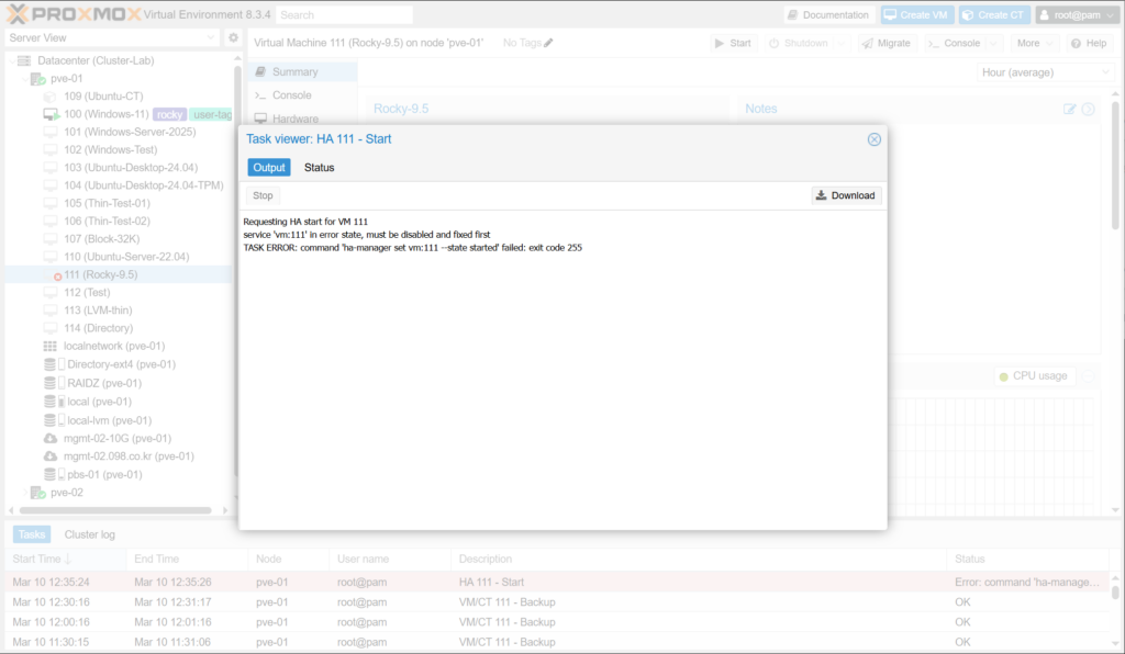 VM의 하드웨어 설정을 변경한 다음에 시작이 안되고 command 'ha-manager set vm:111 --state started' failed: exit code 255 오류가 발생합니다.