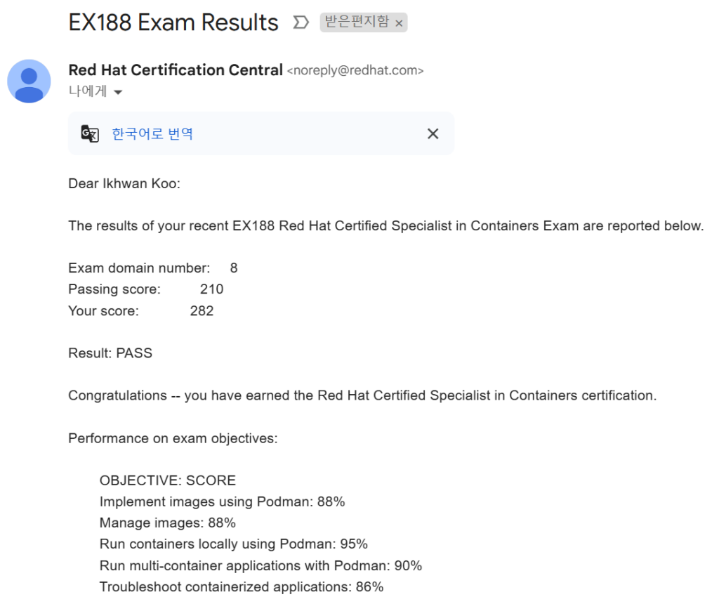 배경이 되는 교육 과정은 DO188 입니다. 3일 교육 과정으로 Podman 기반으로 구성되어 있습니다. 쿠버네티스와 OpenShift와 관련된 내용이 20%를 차지하고 있지만, 나머지 80%는 Podman 기반으로 컨테이너를 다루는 내용입니다. 이 과정의 Lab만 충분히 연습하면 EX188은 무난해 보입니다.