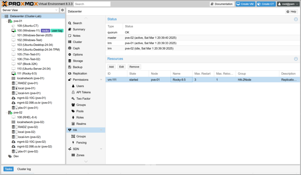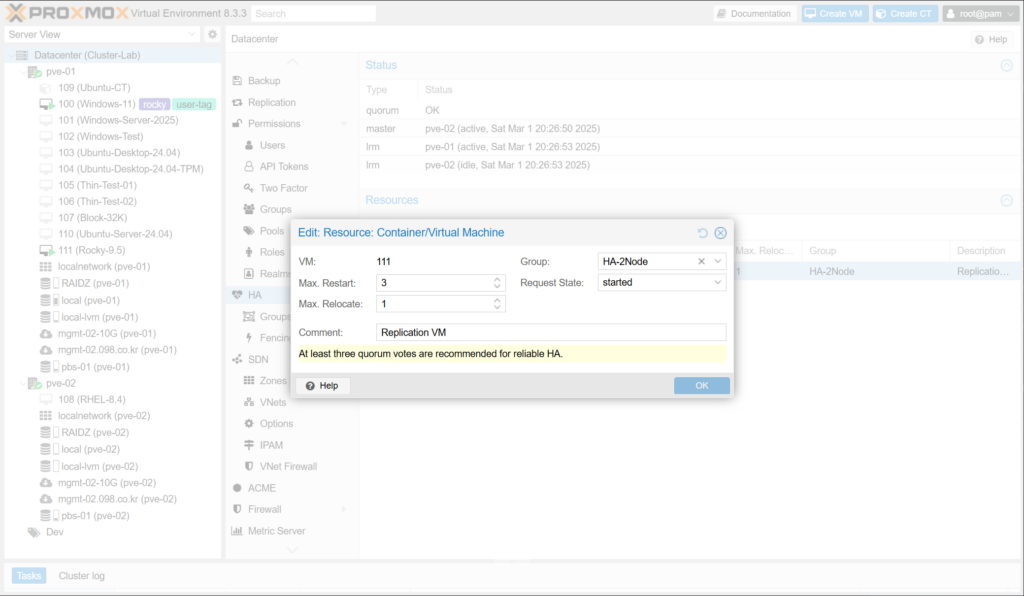 Datacenter > HA > Edit는 특정 VM 또는 컨테이너(CT)를 보호 대상 설정 정보를 수정합니다.