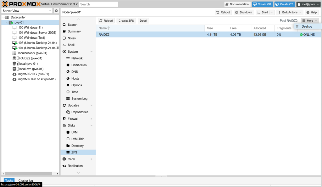 ZFS 풀이 필요 없을 때 삭제하는 Destory 기능을 제공합니다. Destory 기능은 CLI로 치면 zpool destroy 명령과 같은 기능입니다.